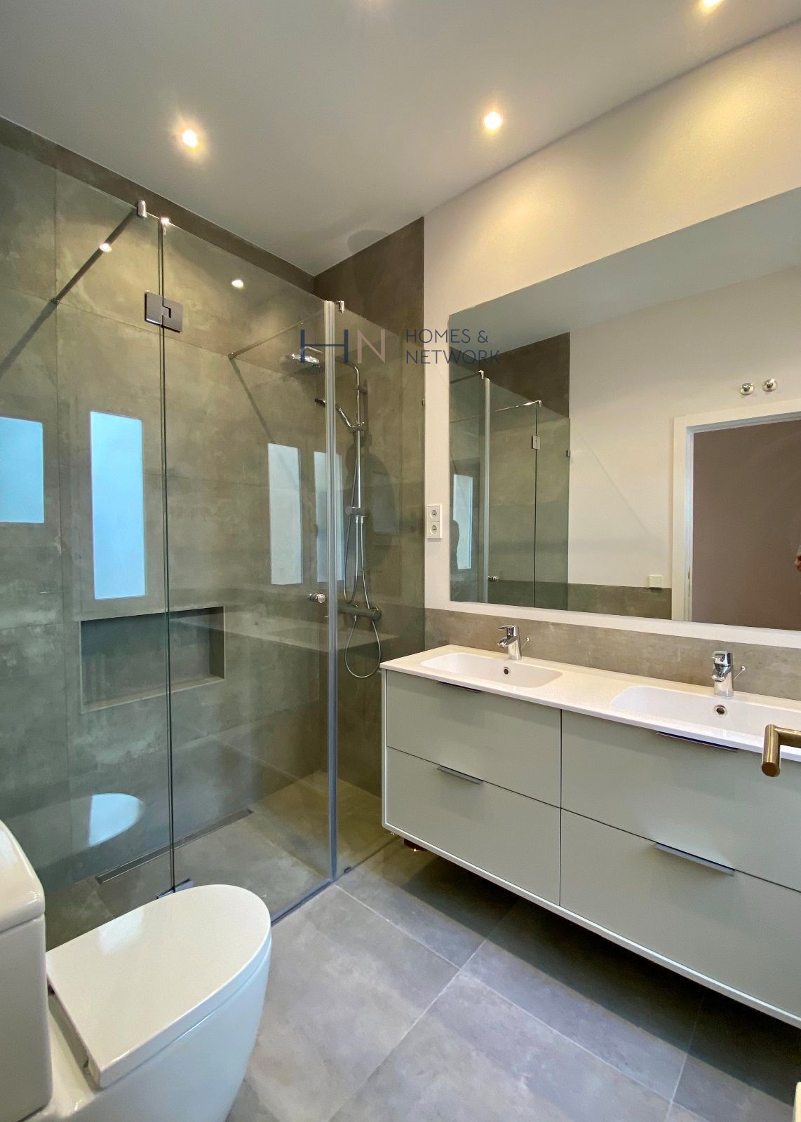 El dormitorio principal es exterior y tiene un ventanal grande, vestidor y baño completo con ducha y bañera. Hay otras dos habitaciones que comparten un baño y otra más con baño en suite, dando todas a patios grandes y agradables. Aseo.