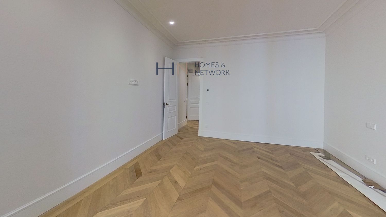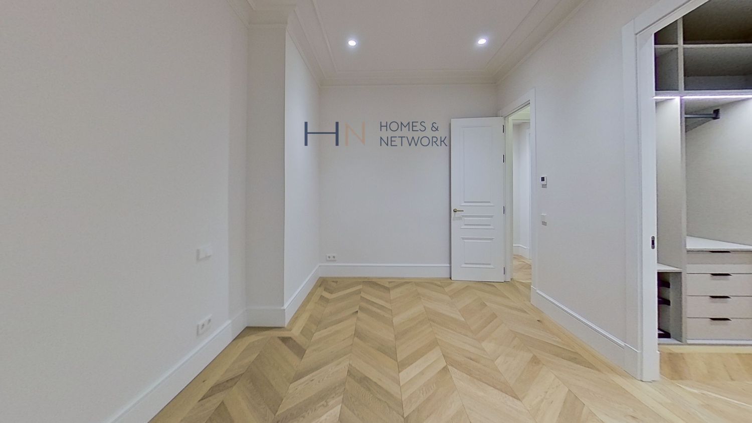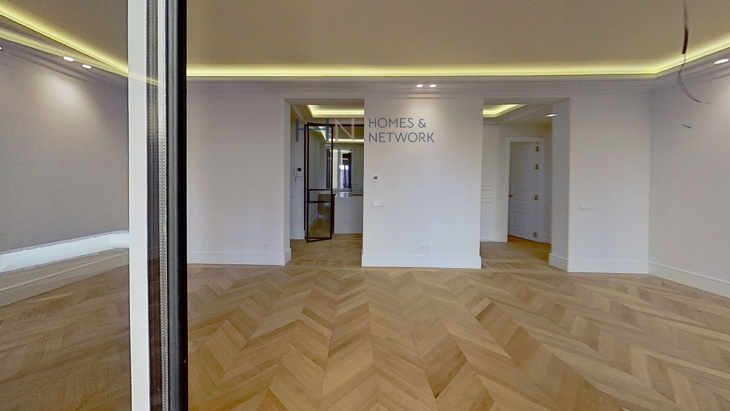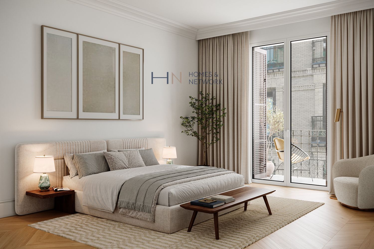 La vivienda ocupa una 1ª planta muy alta, lo que le otorga una luminosidad excepcional. Completamente reformado cuenta con un espacioso salón-comedor con 3 balcones, una cocina totalmente equipada, 3 dormitorios con vestidor y baño en suite, un baño de invitados y una práctica zona de lavandería.