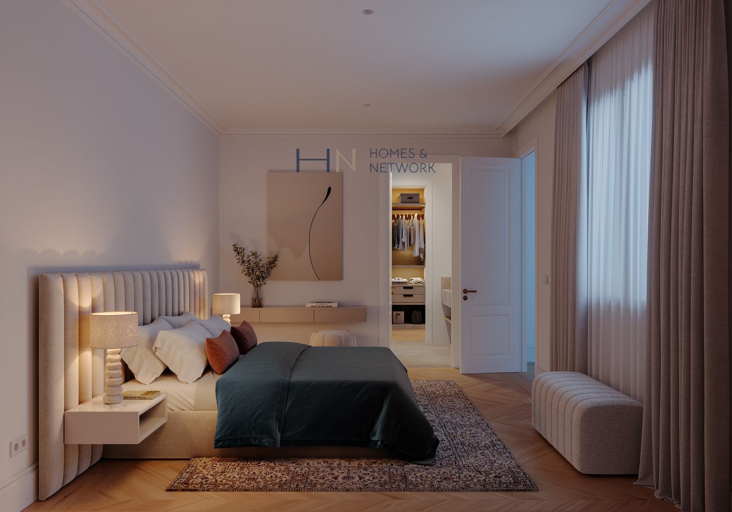Dispone de 3 dormitorios, cada uno con su propio baño en suite, además de un baño adicional para invitados y un elegante despacho. La zona social incluye un espacioso salón-comedor, inundado de luz natural gracias a sus 4 balcones que dan a la calle. La propiedad también cuenta con una cocina moderna y funcional, acompañada de una práctica zona de lavandería.