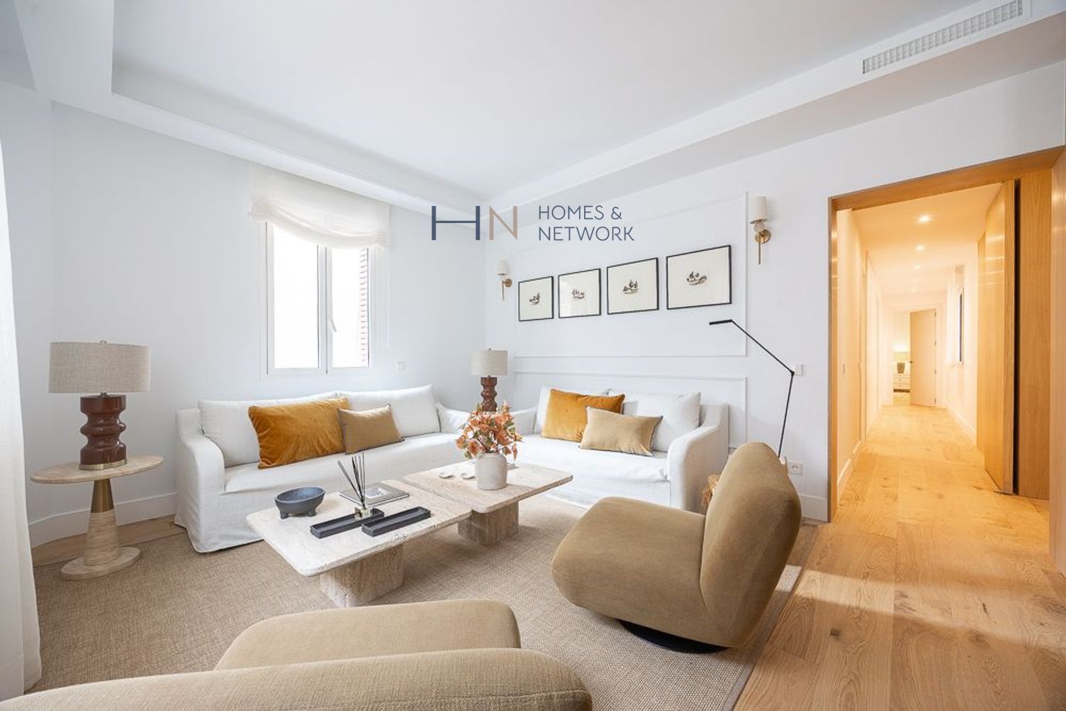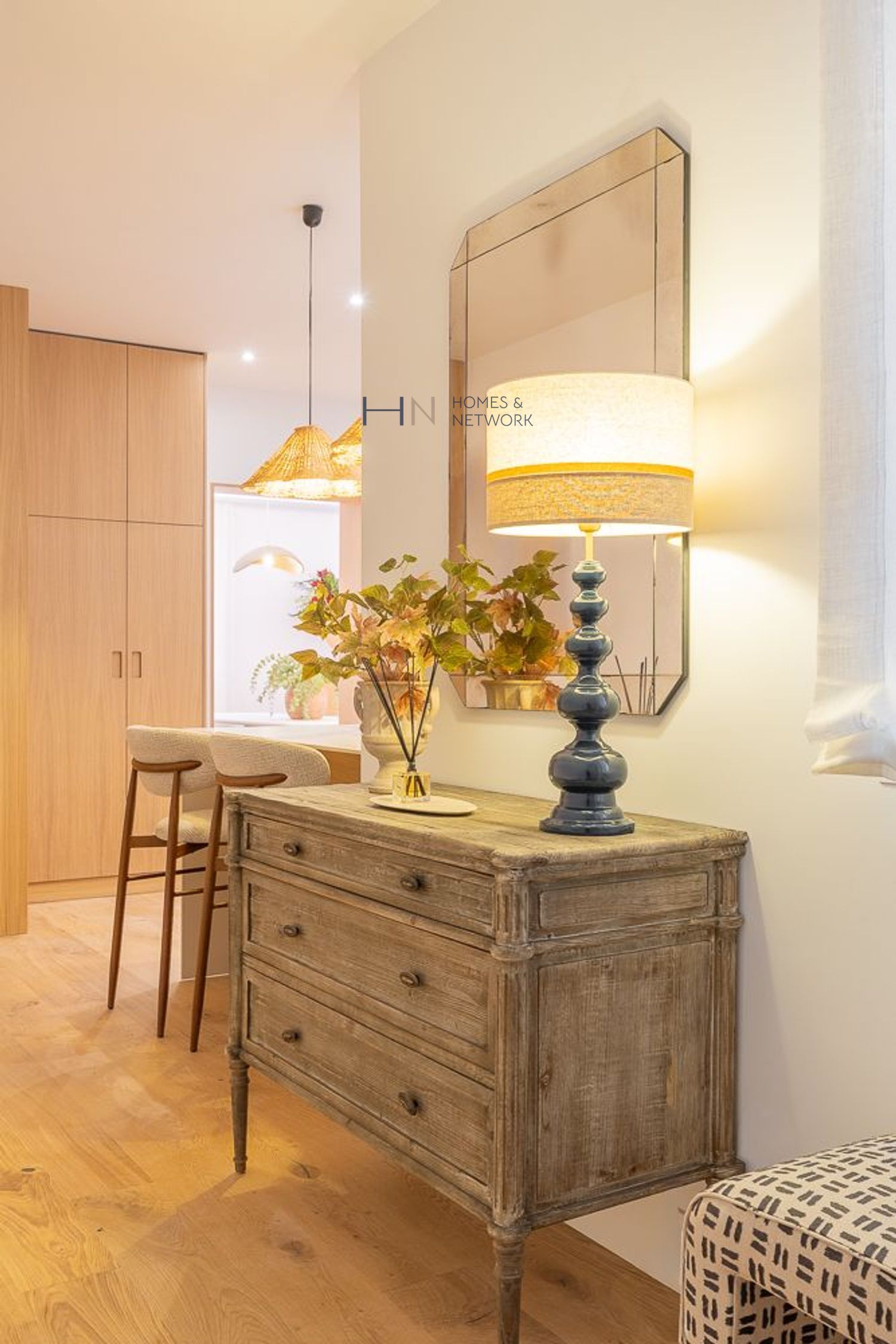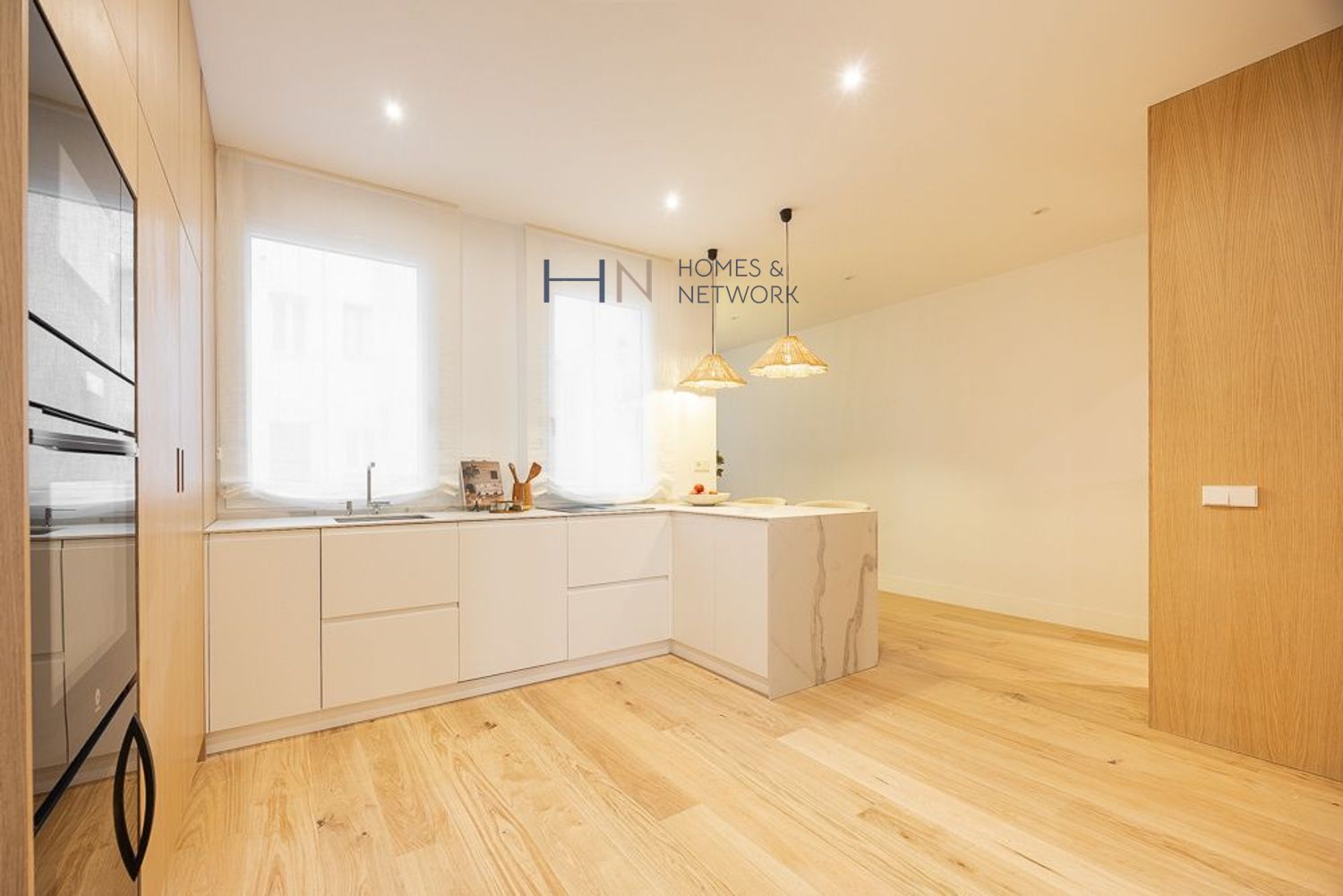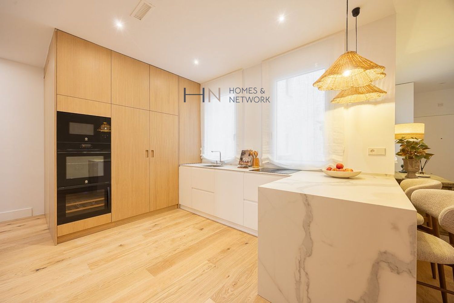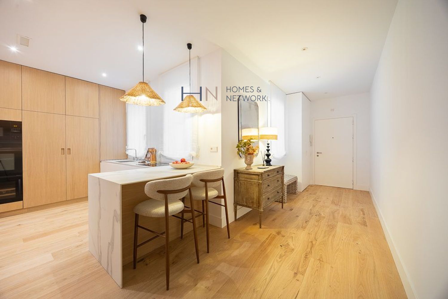 Al entrar, te recibe un acogedor recibidor que da paso a un salón-comedor distribuido en dos ambientes. Tres grandes ventanales ofrecen vistas a la calle, llenando el espacio de luz natural. La cocina, completamente equipada con una gran isla y electrodomésticos de alta gama.